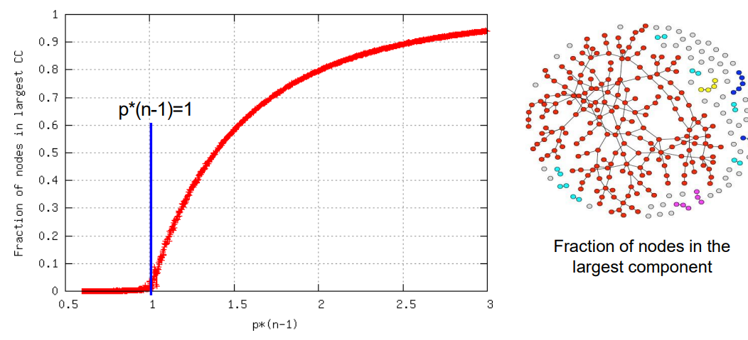 따라서 다음과 같은 그림에서 왼쪽의 그래프에 빨간색 노드로 연결된 것이 GCC이고 이는 k가 1이상일 때 GCC가 생성이 된다. plot은 실제로 실험한 G_np의 측정값이다.
