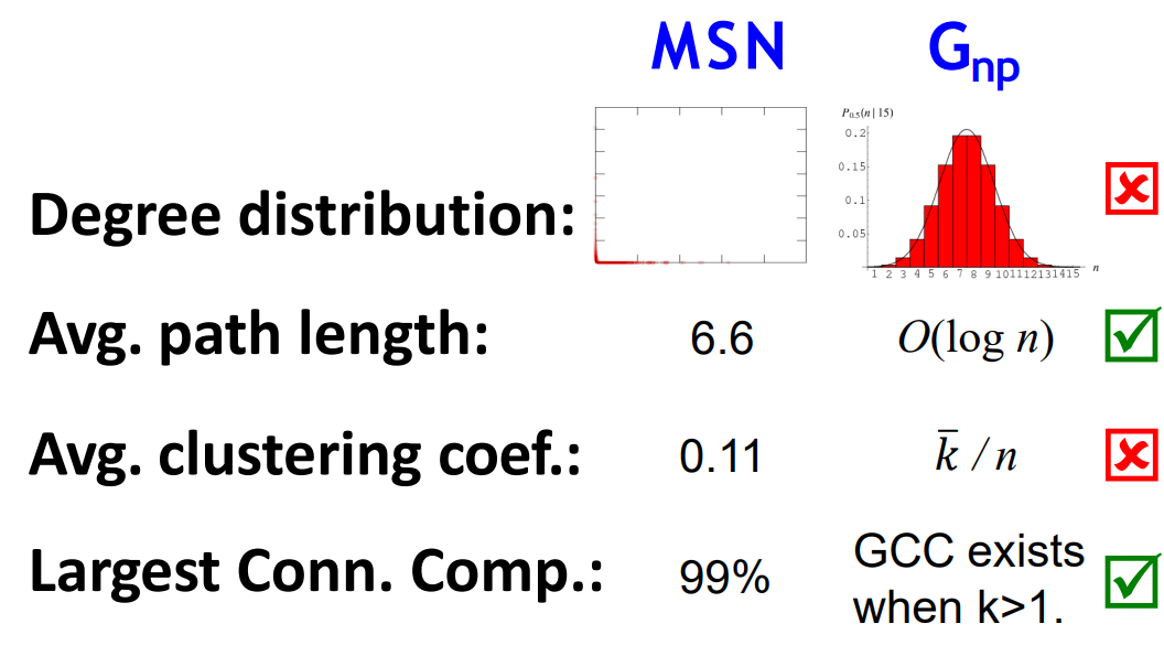 MSN 네트워크의 특성을 보면 대부분의 노드들의 degree는 1이고 heavy tail(0.1%) 부분의 degree가 엄청나게 많은 형태를 띈다. 반면에 G_np 같은 경우는 모든 edge들이 uniform하게 degree를 갖는다. 따라서 이는 다를 수 밖에 없다.