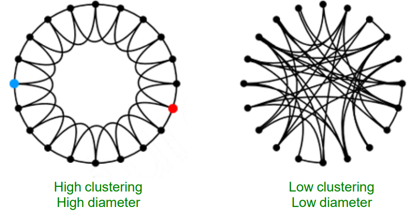 따라서 이러한 작업을 거친 graph들을 small world라고 불리우고, 이러한 작업을 통해 high clustering coefficient low diameter가 이뤄지게 된다.