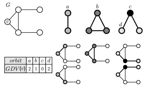 그래프 G에서 node_v의 역할에 대해서 봐보자. a,b,c,d 는 graphlet에 있는 각각의 노드 역할 번호이다.