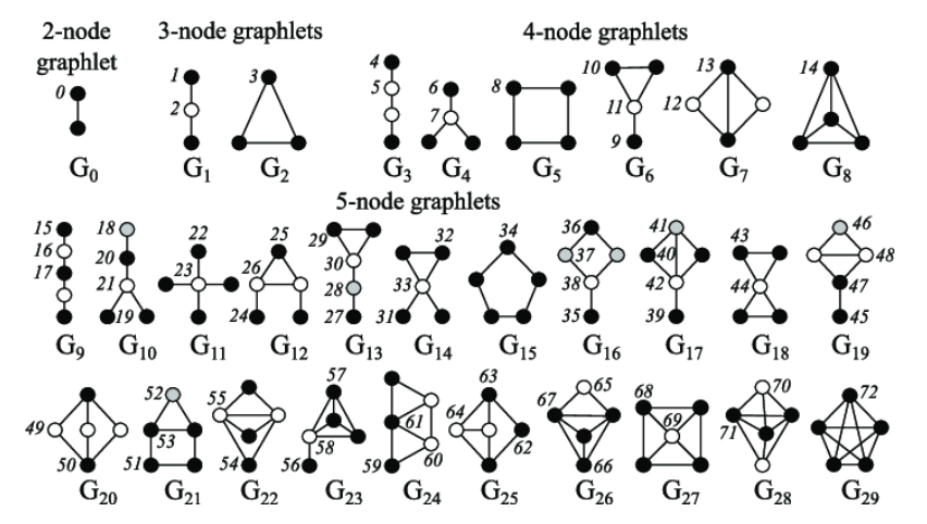 graphlets은 subgraph와 비슷한 개념이다. non-isomorphic subgraph이다.(모양에 초점).
