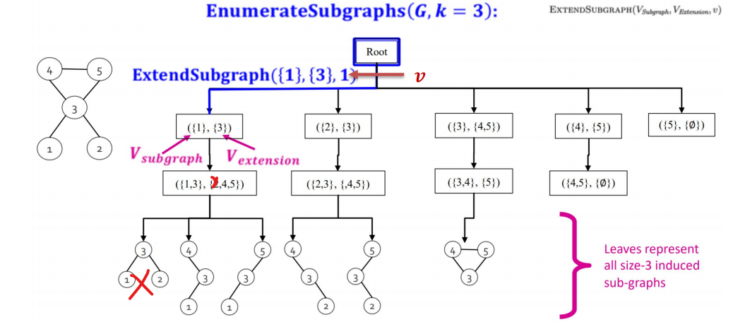 첫번째로 node1에 대해서 보자. node1과 연결된 자신보다 큰 아이디를 가진 노드는 3이다. 따라서 V_subgraph에 1이 추가가 되고, V_extension에 3이 추가가 된다. 다음 트리에서 {1,3} 은 input으로 들어간 값을 말하고, node3과 연결된 이웃 중에 큰 index를 가진 값을 고른다. 그림에선 2가 있었는데 3보다 작으므로 삭제가 되어야한다.