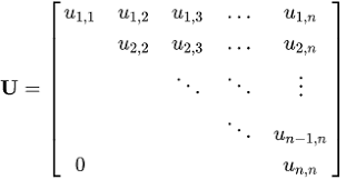 여기서 빈 부분은 모두 0의 값을 가진다고 생각하면 된다. 이러한 행렬에서 determinant를 계산하면 대각성분의 곱으로 나타낼 수 있다. 즉, 위 그림이 3x3 matrix라고 할 때 det U = u11*u22*u33 이 되는 것이다.