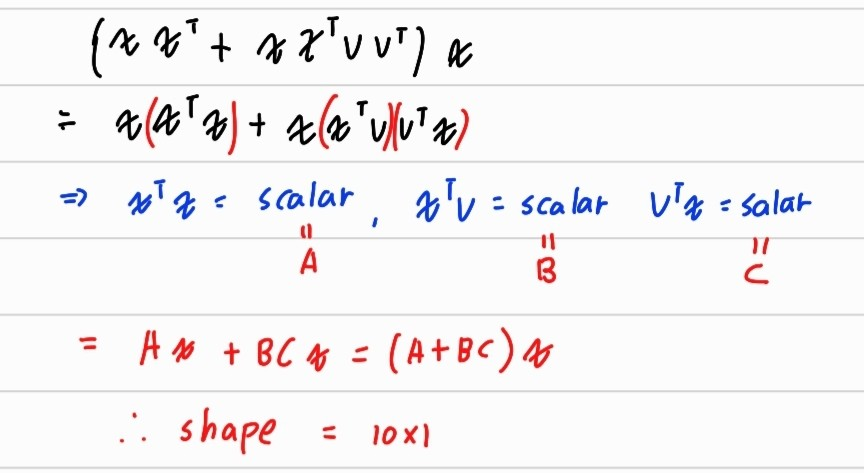Q : 만약 10차원 종벡터 \( x = (x_{1}, ... x_{10})^{T} \)에 대해 (v도 10차원 종벡터) \( y = xx^{T}(I+vv^{T})x \) 를 계산하여 shape을 말하시오.