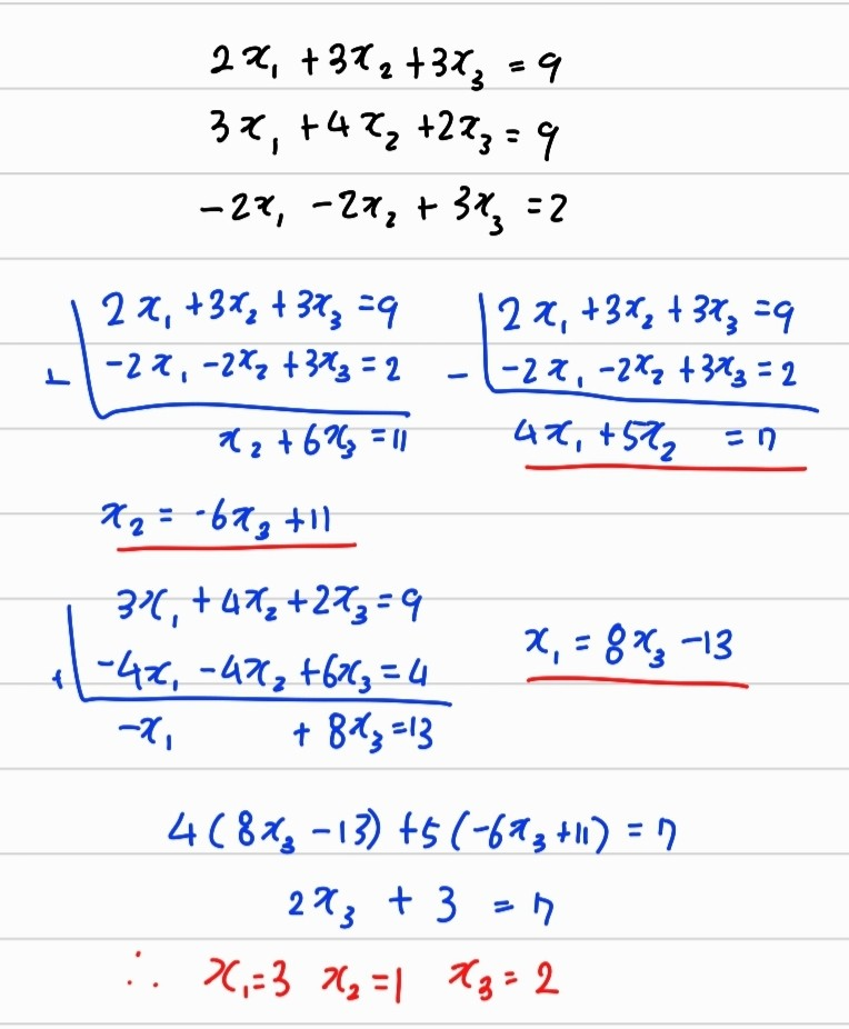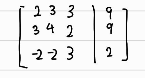 $$ \begin{cases} 2x_1 + 3x_2 + 3x_3 = 9 \\ 3x_1 + 4x_2 + 2x_3 = 9 \\ -2x_1 - 2x_2 + 3x_3 = 2 \end{cases} $$