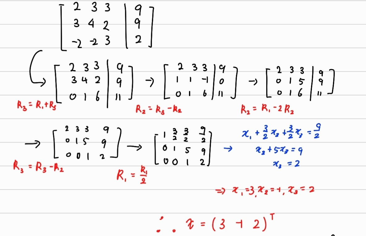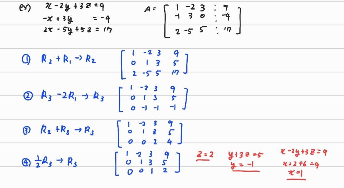 기본행 연산을 통해 행렬을 변환시키고 한 변수가 나왔을 때 행렬 변환을 멈춘다. 그리고 첫 행의 첫번째 원소는 1을 만들어준다. 그리고 변수 소거법을 통해 답을 도출한다.