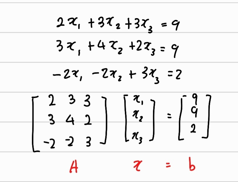 Ax = b 형태로 연립방정식이 형성되기 때문에 x의 해를 구하기 위해선 \( A^{-1}Ax = A^{-1}b \) 식을 통해 x를 풀이할 수 있다.