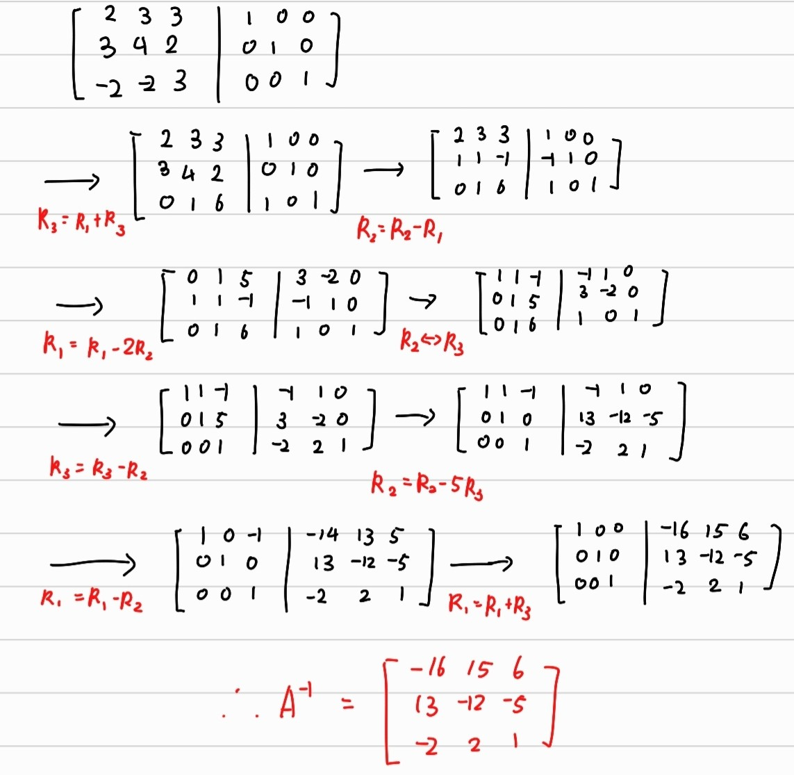 일부러 아까와 다른 기본행 연산을 통해서 계산하였다. 즉, 기본행 연산의 순서는 중요하지 않다.