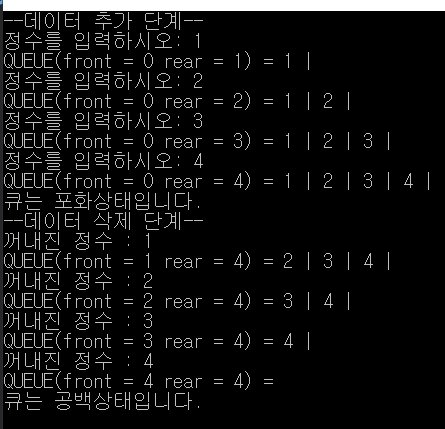 C로 구현한 원형큐 코드는 큐가 꽉 찰 때 까지 입력을 받고 꽉 차면 삭제하는 것을 구현하였다.