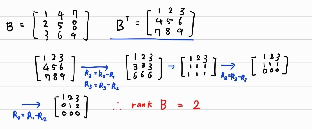 B를 먼저 Transpose 한 후 기본행 조작을 한다. 그리고 여기서 0이 아닌 행의 개수를 구한다. 이러면 rank이다.