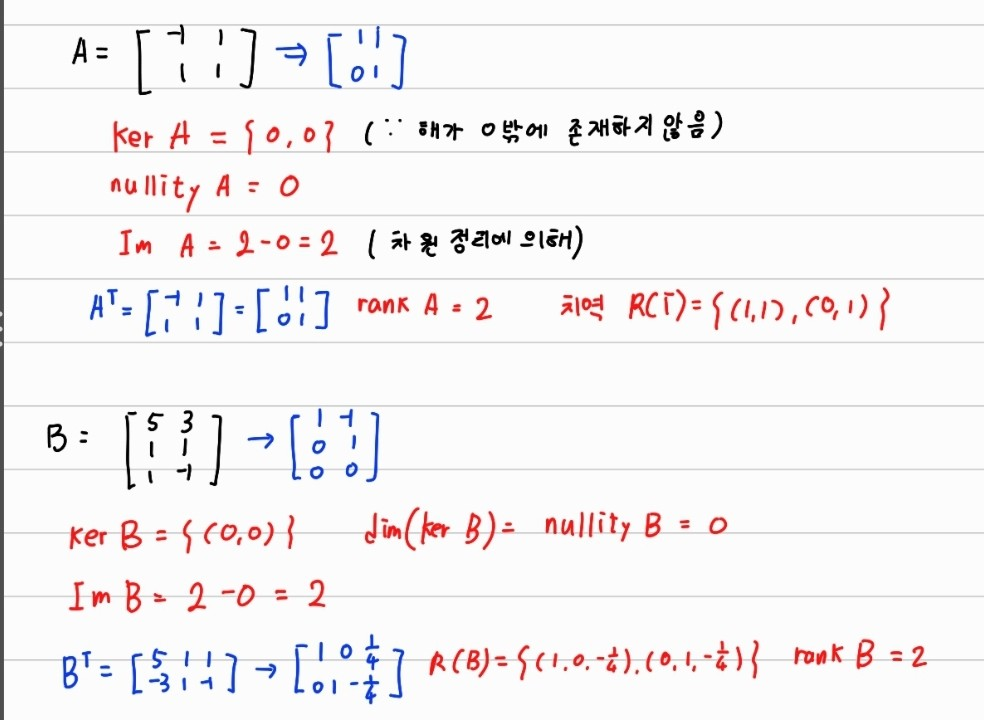 그리고 마지막으로 치역은 행렬에서 Transpose한 후 행 사다리꼴 형태(대신 대각행렬은 모두 1) 일 떄 0이 아닌 모든 행들을 치역의 기저들이고 그리고 이 치역의 기저들의 차원이 rank 이다.