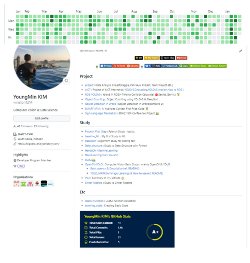 그리고 깃허브 같은 경우는 첫 페이지를 첨부하였다. 왜냐하면 나는 홈페이지에 첫 장에 많은 것을 정리하였기 때문이다. 그리고 나는 잔디밭이 많이 채워져 있으므로 이를 어필하였다.