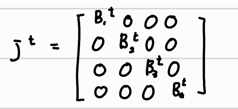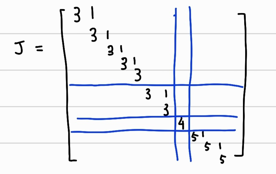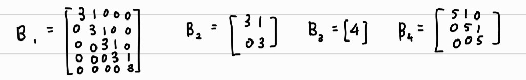 이런 jordan cell B를 이용하여 전체 jordan matrix의 거듭제곱 계산을 해보자. 다음과 같은 J matrix가 있다고 하자