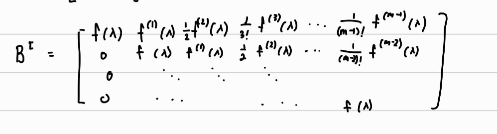 이렇듯 대각 성분이 \( \lambda \) 인 jordan cell B에 대해 B^{t} 를 계산하면 \( {}_t C_s \lambda^{t-s} \) 항이 나타난다. 이렇게 해서 더욱 일반화 된 식을 봐보자