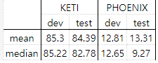 \multirow{2}{*}{} & \multicolumn{2}{c|}{KETI} & \multicolumn{2}{c|}{PHOENIX} \\