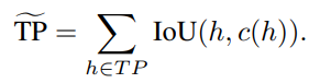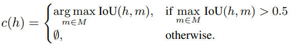 GT와 Predict mask의 IoU에 따라서 \( c(h) \) 로 나타냄. 즉, IoU(h,m) > 0.5 일 때 IoU max 값으로 c(h) 설정. 그 밑에면 공집합 처리