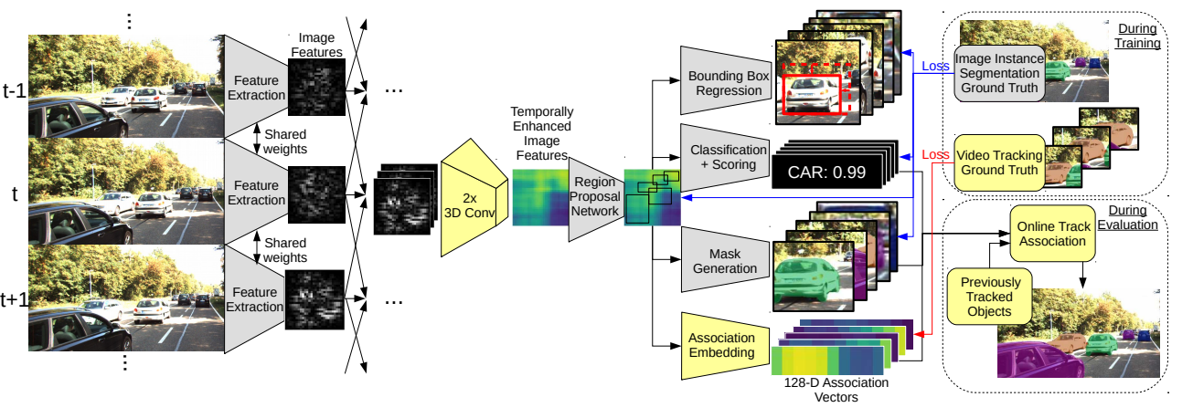 Track R-CNN은 Mask-RCNN을 시간 정보를 통합하고 시간이 지남에 따라 re-identification에 사용되는 연결 헤드에 의해 3d-convolution으로 확장한다.