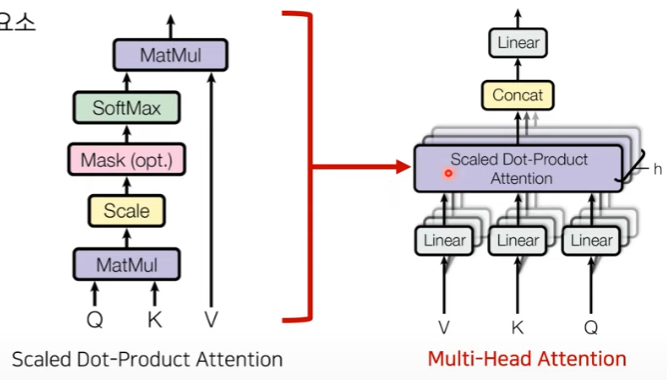 위 그림을 통해서 설명하면, Queary 값과 attention을 수행할 단어들 Key 와 각각 행렬곱(Matmul)을 수행한다. 그 후 scaling을 해주고 필요하다면 mask 처리까지 해준 다음에 softmax를 처리 하면서 어떤 단어와 가장 연관이 있는지 확률적인 점수를 나타낸다. 마지막으로 value 값과 행렬곱을 수행해주면서 최종적인 attention score가 나오게 된다.
