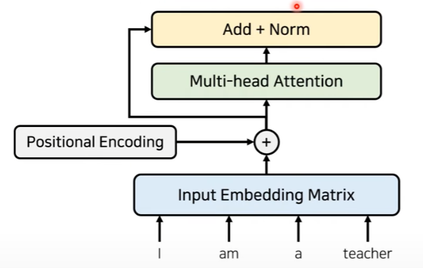 또한, 여기서 추가적으로 residual learning을 사용한다. 즉, Multi-head attention을 거친 값과 postional encoding+ input embedding matrix의 값을 서로 더해준다. 그 이후 noramlization을 해준다. 이는 다음의 그림과 같이 표현된다.