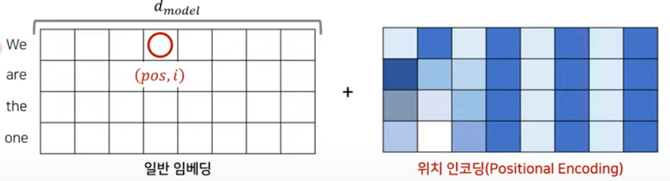 따라서 이렇게 구성한 postional encoding 값과 일반 embedding 값을 element-wise로 더해주어서 단어의 위치 정보를 알 수 있게 한다.