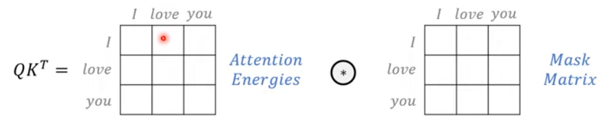 \( QK^{T} \)의 행렬과 mask matrix를 사용하여 특정 단어는 무시하고 학습을 할 수도 있다. \( QK^{T} \)와 mask matrix 를 element wise로 곱해주어서 해당 단어를 무시하게 할 수도 있다.