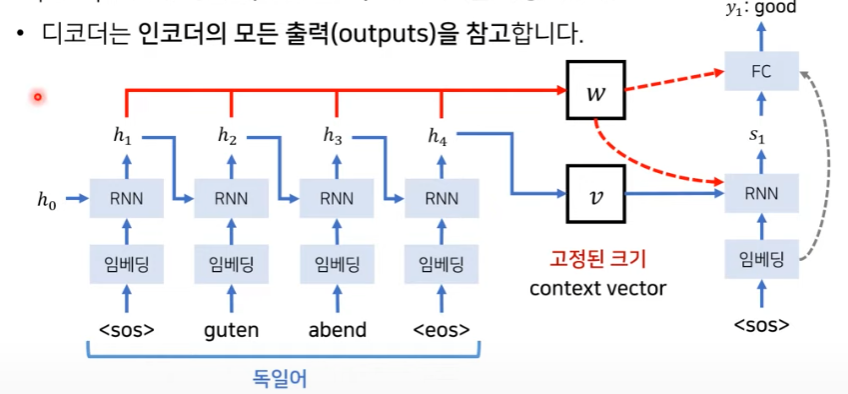 이렇게 encoder에서 나온 attention weight 와 context vector는 decoder에서 다음과 같이 처리된다.