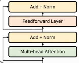 위 그림에서 추가적으로 feedforward layer를 해주고 이를 또 residual connection을 해주면서 transformer의 하나의 layer가 완성된다.