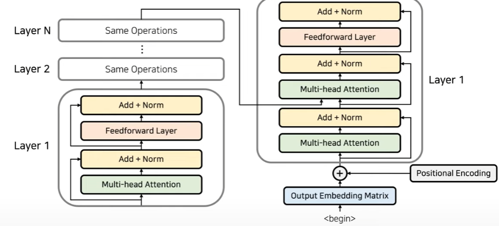 이러한 layer들을 여러개 쌓아서 encoder가 구성이 되고 각각의 layer들은 파라미터가 다 다르다. 이러한 layer들을 쌓는 것이기 때문에 입력되는 dimension과 output dimension은 서로 같다. 이 layer 구조는 decoder에서도 동일하게 적용되며 다음의 그림과 같다.