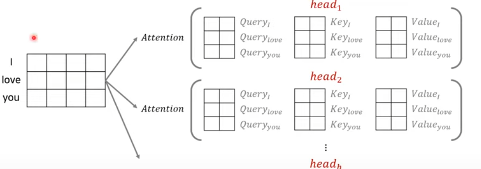Query, Key, Value는 단어의 embedding matrix를 통해 생성된다. 이는 embedding dimension 를 head의 개수 h로 나눈 각 Q,K,V의 dimension이 구성된다.