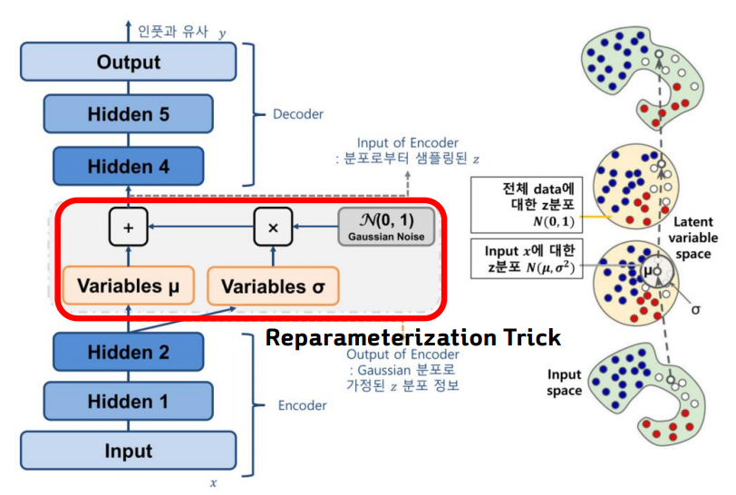 먼저 Encoder 부분에선 input의 정규분포를 따르는 latent variable을 생성하도록 학습한 뒤 이 분포의 \( \mu \) 와 \( \sigma \)를 학습한다. 그리고 gaussian noise와 latent variable의 \( \sigma \)를 먼저 곱하고 이 후 이 분포에 \( \mu \)를 곱하여서 decoder의 input으로 전달한다. 이러한 과정을 통해 이는 backpropogation이 가능하게 되고 이를 Reparameteriztion Trick 이라고 한다.