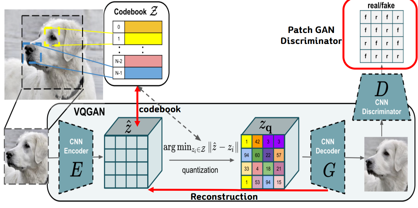 이렇게 구성한 \( z_q \)를 decoder에 넣어 reconstruction image를 생성합니다. 그리고 이를 discriminator에 넣어 patch 단위로 real 인지 fake 인지 판단한다.