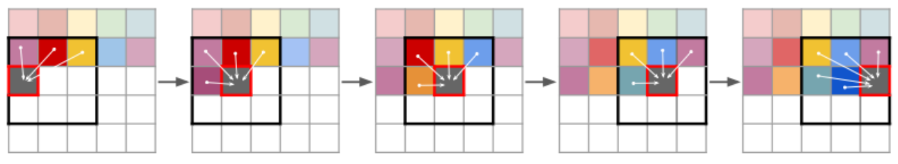 반면에 CNN은 일반적으로 입력값의 이미지 크기보다 작은 하나의 filter를 통해 sliding window 방식으로 convolution 연산을 한다. 필터가 이미지의 일부를 대상으로 연산을 수행하기 때문에 이는 CNN의 entity 간의 관계가 서로 가까운 값들 간에 존재한다 말할 수 있고, 이는 어떠한 특성을 가지는 값들이 모여 있는지에 따라 중요하게 판단할 수 있는 구조가 된다.