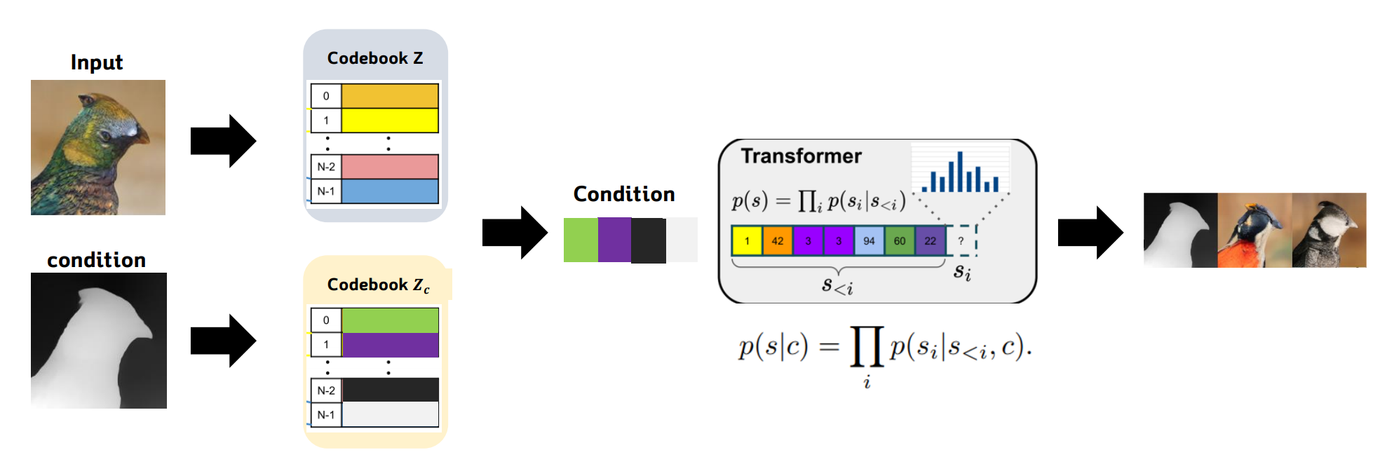 이러한 condition은 input 과 마찬가지로 1-stage에서 학습을 하여 각각의 codebook Z와 \( Z_c \)를 생성한다. 그 후 이를 바탕으로 codebook \( Z_c \)를 조건으로 주어 다음의 patch 를 예측하게 된다.
