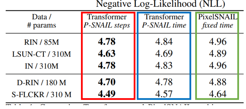 t 라는 정해진 시간 동안 Transformer는 k step을 학습하고, Pixel Snail은 2k step을 학습한다.