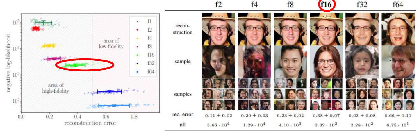 따라서 위 결과와 같이 downsampling factor가 작아지면 reconstruction는 잘하고, image generation은 잘 못한다.