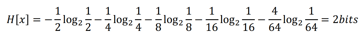 이를 entropy 값을 구하면 필요한 bit 수가 나오게 된다. 계산의 편의상 ln 대신 \( log_2 \)를 써서 계산하면 다음과 같다.