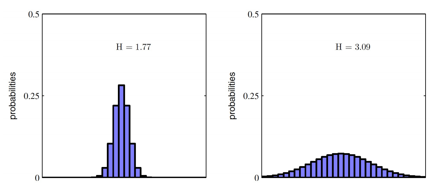 따라서 uniform distribution을 따르는 확률이 entropy가 더 높아짐을 알 수 있다.