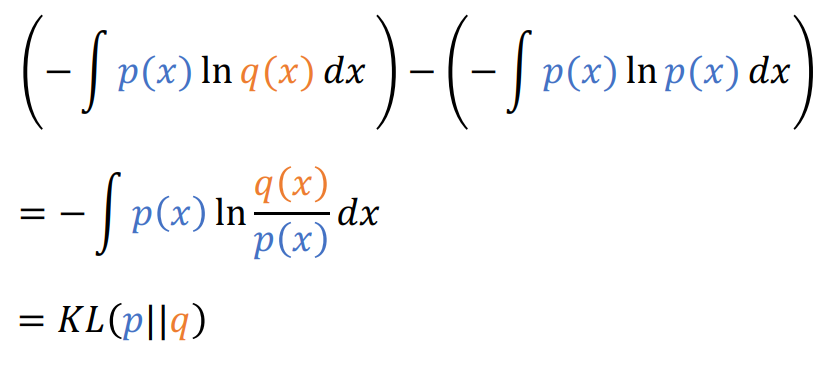 따라서 q(x)에 기반한 근사하는 entropy 값에 실제 entropy 값을 빼줌으로써 KLD 공식이 나오게 된다.