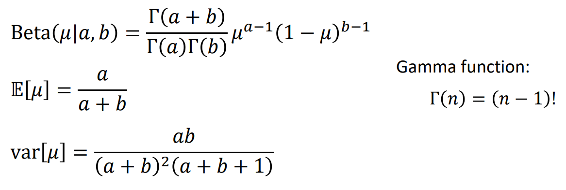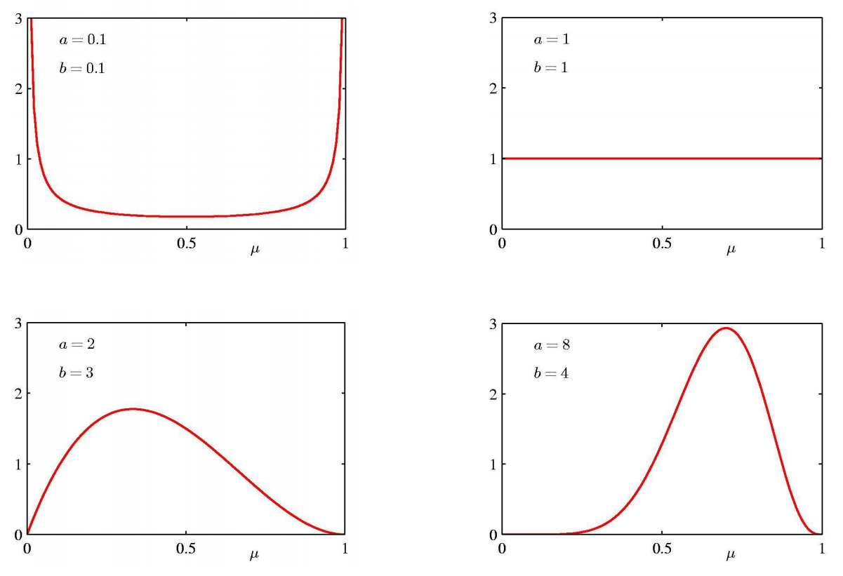 Beta distribution은 확률에 대한 확률 분포이다. 이는 앞서 말한 \( \mu \) 가 [0,1] 사이로 범위가 제한되어 있다는 것이다.