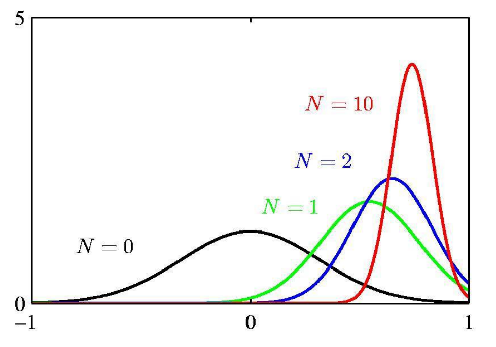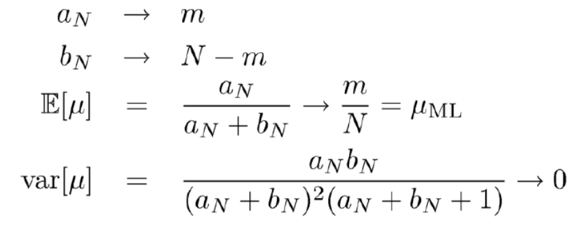 이러한 posterior distribution의 또 다른 성질에 대해 알아보자. Beta distribution을 따르는 posterior distribution의 dataset size( N )가 매우 커지게 되면