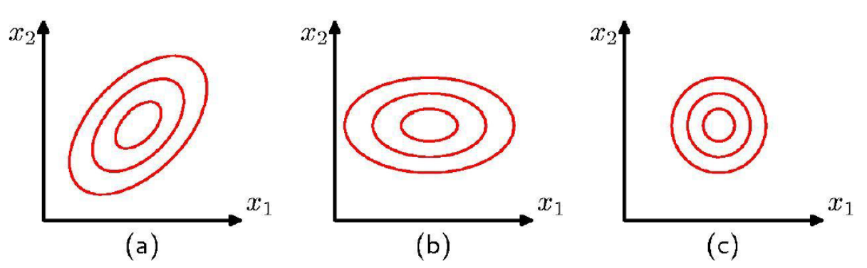 위의 그림은 covariance \( \Sigma \)와 관련이 있다. (a)는 일반적인 경우에 해당이 되고 (b) 같은 경우는 \( \Sigma \)가 diagonal matrix일 경우이다. diagonal matrix 같은 경우에는 대각원소 외에 모두 0이 되는데 이는 x1 과 x2가 서로 연관이 없다라는 것을 의미한다. (c)는 \( \Sigma \)가 Identity Matrix * scalar = \( \lambda I \)값일 때를 의미한다. 즉 이는 x1과 x2가 같은 variance를 가진다는 것을 의미한다.