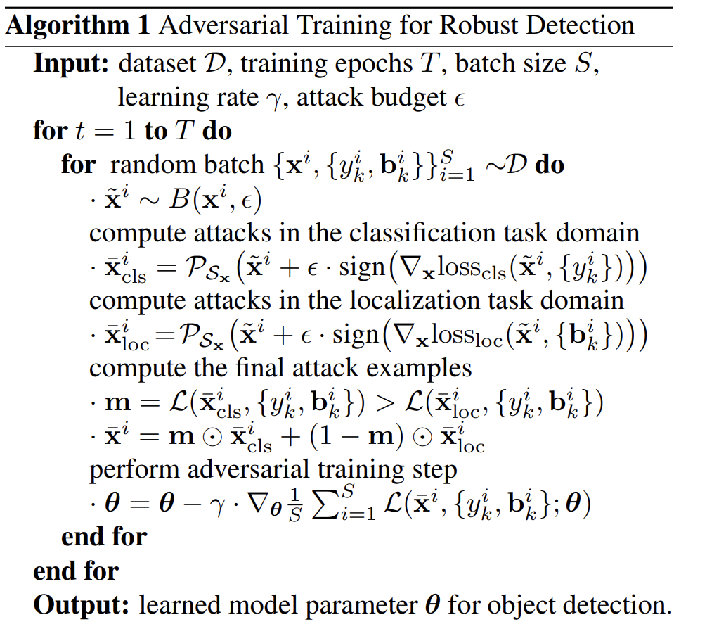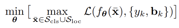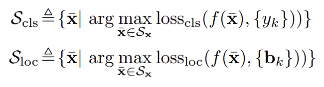 task-oriented domain constraints : task에 무관한 S_x 제약조건을 사용하는 일반적인 adversarial training setting 과 다르게 task-oriented domain contraint ( \( S_{cls} \cup S_{loc}\) )를 소개한다. 이는 classification 또는 localization loss 중 하나를 최대화 하는 이미지 집합으로 허용 가능한 domain 을 제한하는 것이다. 최종적인 final adversarial example은 이러한 집합에서 .전체적인 loss를 최대화 하는 것이다. 이로써 task-domain constraints을 갖춘 formulation 이 되고 이는 서로 task 에 대해 간섭하지 않는 이점을 얻을 수 있다.