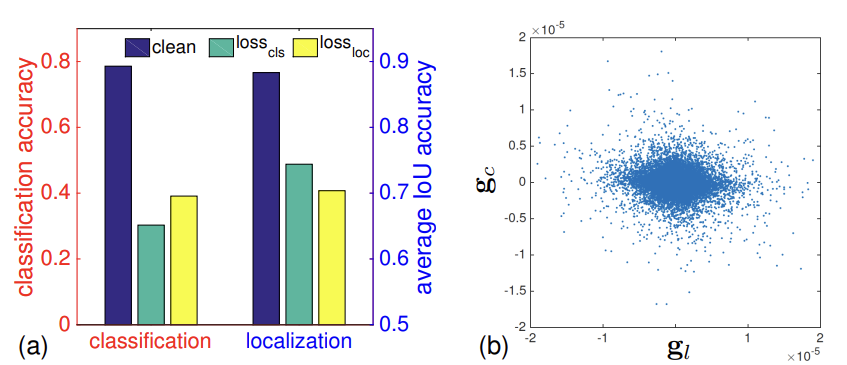 본 논문의 두번째 observation은 " 두 task 의 gradient는 일부는 공통된 방향을 공유하지만 완전히 일치하지 않는다. 따라서 misaligned 된 task의 gradient가 발생하여 추후 adversarial learning을 혼란스럽게 할 수 있다." 라는 것이다. 이를 증명하기 위해 두 loss에서 파생된 이미지의 gradient 를 분석한다. 즉, \( \nabla_{x}loss_{cls} \) 와 \( \nabla_{x}loss_{loc}\) 의 값을 구하여 분석하는 것이다. 이에 대한 scatter plot 을 그려서 분석하여 각 task 의 gradient 크기가 같지 않고, 방향이 일관되지 않는다는 것을 보였다. Fig 3-(b) 참고