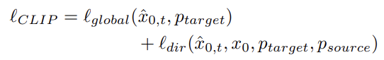 여기서 \( l_{global}\) 은 styleclip의 loss 를 사용해서 diffusion 의 latent image와 style text 간의 cosine similiarity를 구한다. 그리고 \( l_{dir}\) 은 CLIP embedding space에서 mode collapse 와 corrupted image quality 때문에 발생하는 문제를 해결하기 위해 추가한 항으로 다음과 같은 식으로 이루어진다.