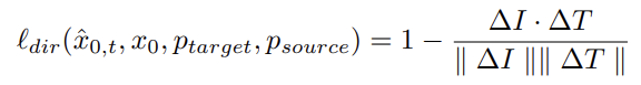 \( \Delta I \)는 latent image 와 input 이미지의 차이를 의미하고, \( \Delta T \)는 target text 와 source text 의 embedding 차이를 의미한다. 따라서 이는 cosine similiarity 2개가 합쳐진 것을 의미한다.