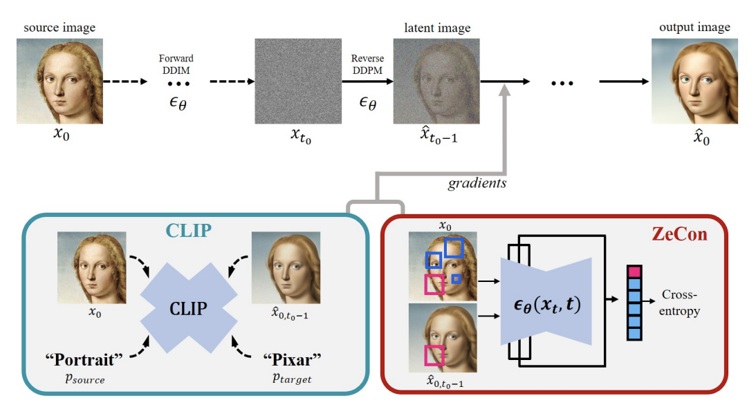 DDIM 으로 Forward 하고, Reverse 과정에서 DDPM을 사용. 그리고 Reverse 중간중간에 CLIP loss와 ZeCon loss를 추가해주면서 Style과 Content 에 대한 학습을 이룸. main contribution 중 하나는 추가적은 training 없이, guide 가 가능하다는 것이다.