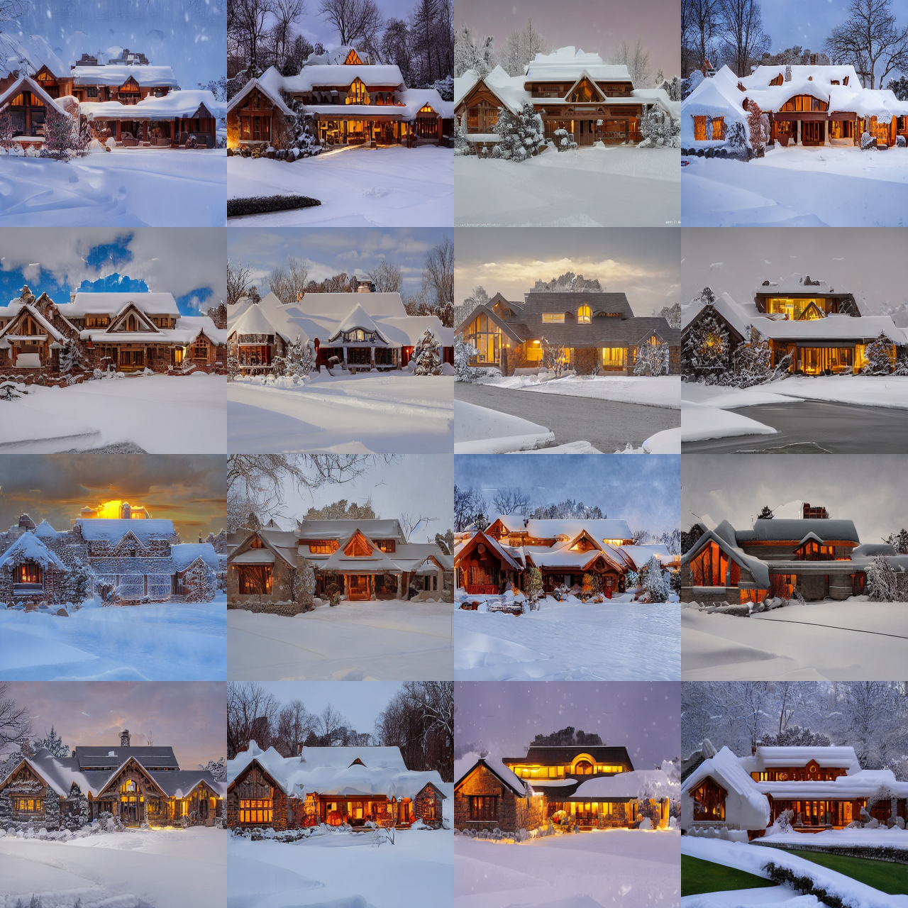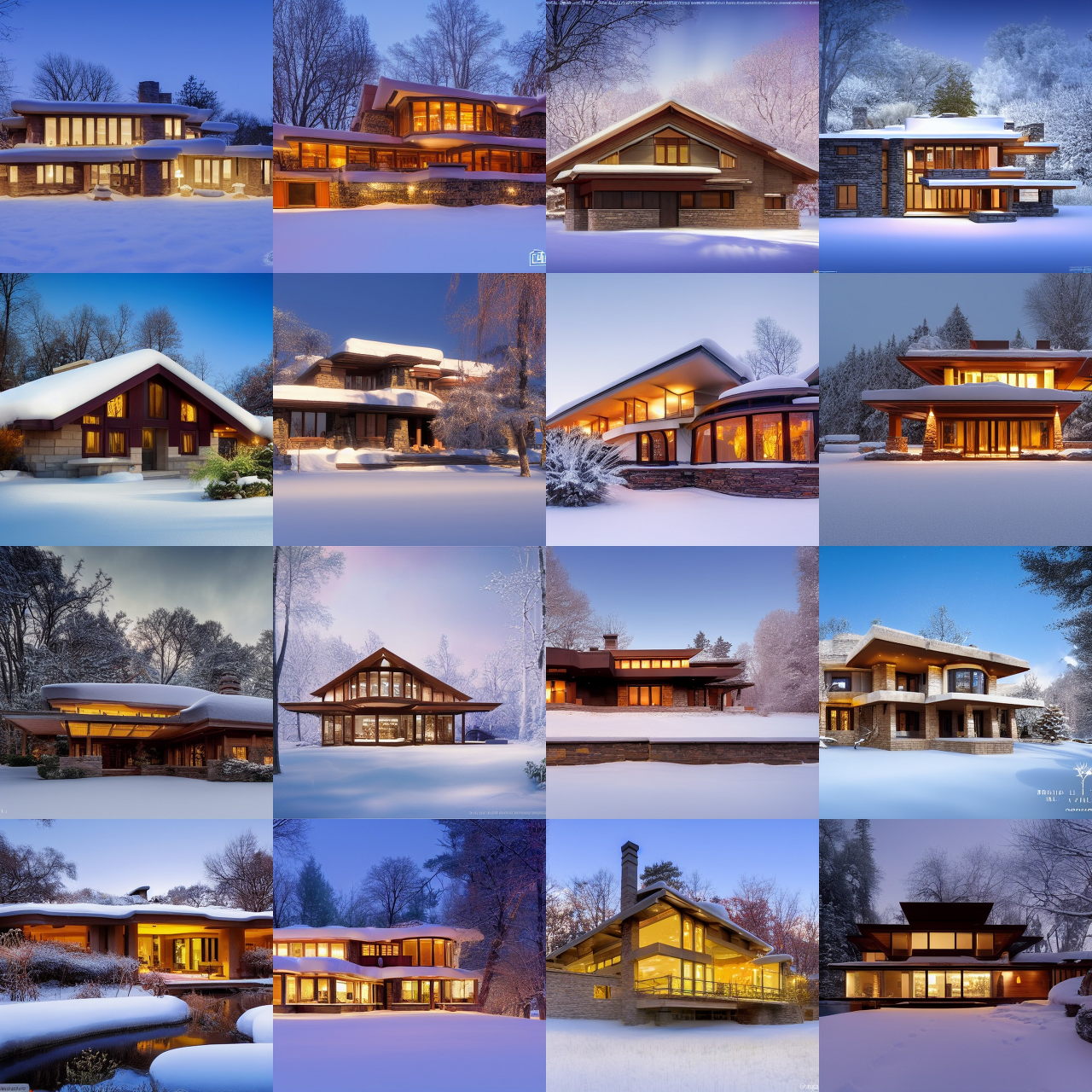 prompt는 "Professional high-quality wide-angle digital art of a house designed by frank lloyd wright. A delightful winter scene. photorealistic, epic fantasy, dramatic lighting, cinematic, extremely high detail, cinematic lighting, trending on artstation, cgsociety, realistic rendering of Unreal Engine 5, 8k, 4k, HQ, wallpaper"