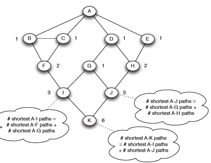 K 노드에서 edge betweenness를 구하는 과정을 설명한다. K node에선 자식노드의 node flow가 없으니 1+0으로 1이 나온다. 그리고 여기서 두갈래로 뻗어 있으니 parents의 비율을 보고 판단한다. 여기서 parents node는 3,3 으로 1:1 비율이기 때문에 K-I , K-J 로 가는 edge의 edge betweenness 는 각각 1/2, 1/2 다.