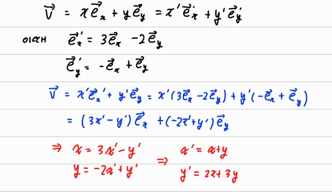 즉 이렇게 도출된 식이 \( v= (x,y)^T \) 에서 \( v' = (x',v')^T \)의 변환 규칙이다. 이렇게 변환 하는 과정을 좌표변환이라고 한다. 이 때 본질은 변하지 않음을 주의한다. 하나의 예를 들자면 한라산의 높이를 km로 나타내든 m로 나타내든 높이의 값은 동일하다는 것을 알아야된다.
