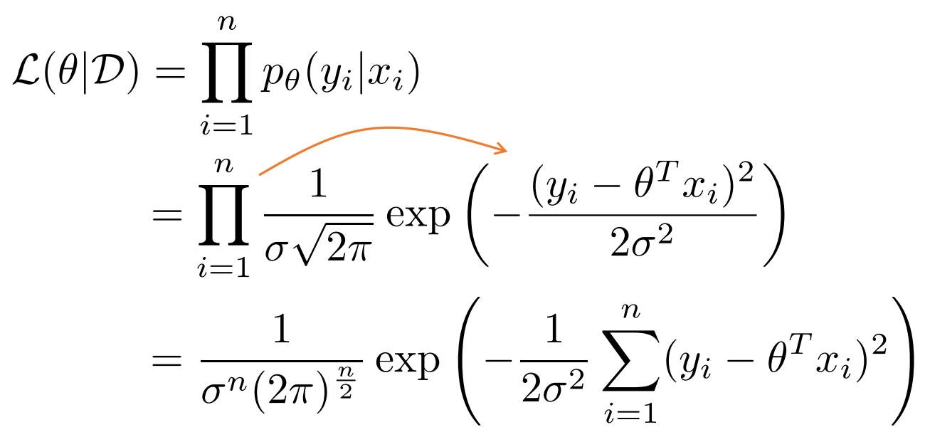 먼저 처음은 likelihood \( p(D|\theta) = p (\{ y_1 , \cdots , y_n \} | \{ x_1 , \cdots , x_n \} , \theta ) \)를 정리하여 나온 식이다.